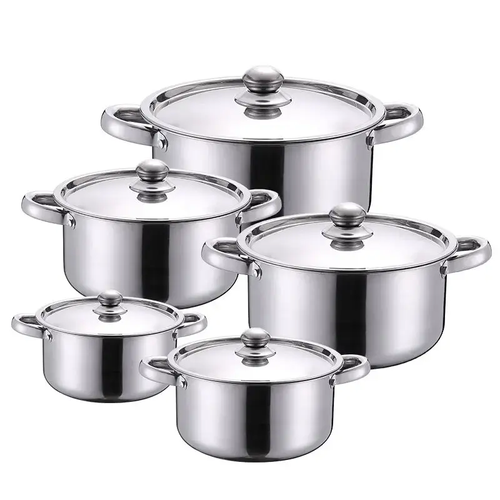 5-Piece Stainless Steel Cookware Set featuring durable pots and pans with lids, polished interior, riveted handles, and heat-resistant knobs